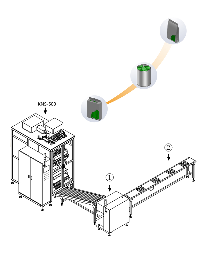 本半自動包裝生產線,由KNS-500自動條狀多列機、自動計數裝置、人工裝盒部分組成,可以自動完成從原料灌裝到自動計數、排出到人工裝盒的一系統過程。是減輕勞動強度和節約成本的結合。
